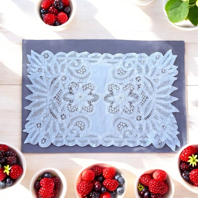 豪華なレースで気品あるテーブルセッティングに演出✨ バテンレースをたっぷりと使用したランチョーマット アフタヌーンティーやパーティーに! ランチョーマットとしておつかいはもちろん、テーブルセンターにご使用も頂ける サイズとなっております。 たくさんの用途でおつかい頂けます❀ 【サイズ】 縦 28cm 横 43cm ※手仕事で制作しているため若干の長さにずれが ある場合もございます。 【お洗濯方法】 お洗濯はネットに入れ弱流水で洗濯機でお洗濯頂けます。 手洗いの場合は押し洗いしてください。 汚れが目立つ際は酸素系漂白剤につけ置きください。長時間のつけ置きは お避けください。 【アイロン】 生地の裏面からアイロンをかけ、レース部分はレースがひろがるように かけると綺麗なレース模様に仕上がります。 なお、スプレーのれをご使用いただきますとより一層綺麗に仕上がります。 当店では、一枚一枚全て職人が手縫いでレースを縫っており、縫製・仕上げも 自社で行っております。(※商品画像は手仕事の例です)