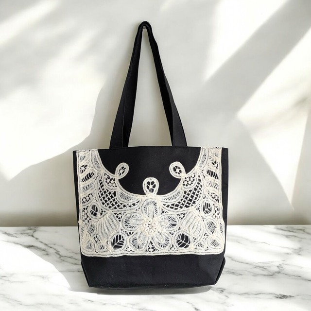 ~大人シックの決定版!黒い生地に映える白いバテンレースバッグ~ こちらの「黒い生地に映える白いバテンレースバッグ」は、シックでありながらスタイリッシュなデザインが魅力です。黒い生地に施された白いバテンレースは、大人の上品さを引き立てます。ウッドの持ち手が高級感を演出し、手に取るとその質感に思わずうっとりすることでしょう。大容量のため、日常使いやお出かけにも最適です! サイズ 32.5cm×41cm マチ12cm 素材 生地 綿100% バテンレース 麻100% 持ち手 9cm×20cm 素材 木材 ご購入前に以下の内容をご確認ください。 (商品について) ●当商品は、職人による手作りです。一つ一つ丁寧に作られており、特別感を感じていただけます。バテンレースがアクセントとなり、シンプルなコーディネートにも華を添えます。 (商品の手入れについて) ●持ち手の木材は強い衝撃には破損する可能性がございます。 (発送について) ●ご注文いただいた商品は、順次発送を行います。発送予定日は別途ご案内いたしますので、ご確認をお願いいたします。発送の際に畳じわがつく場合もございます。ご了承くださいませ。 この黒い生地に映える白いバテンレースバッグは、大人のおしゃれを一層引き立てるアイテムです。普段使いにも特別な日にもぴったりな一品ですので、ぜひこの機会にご検討くださいませ!