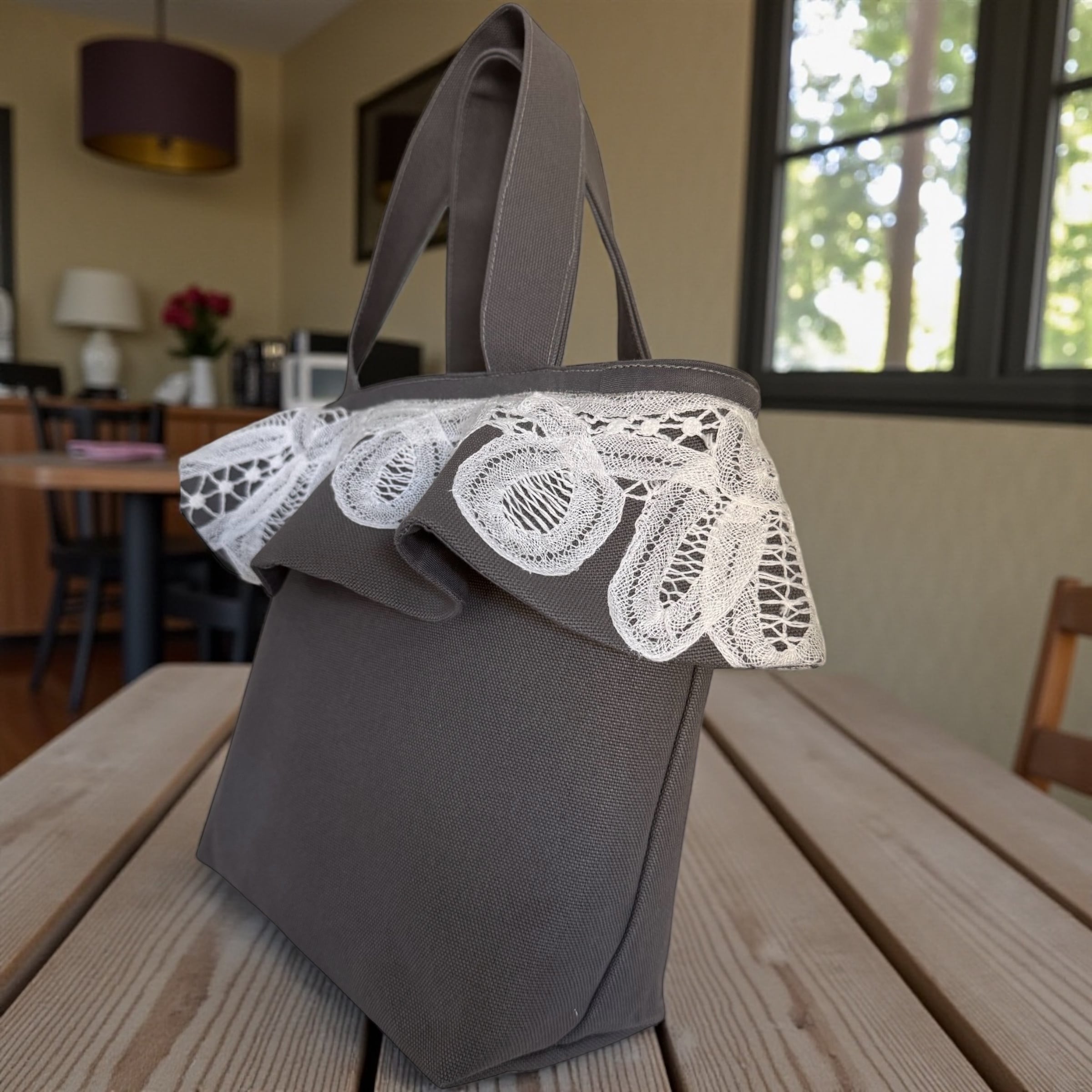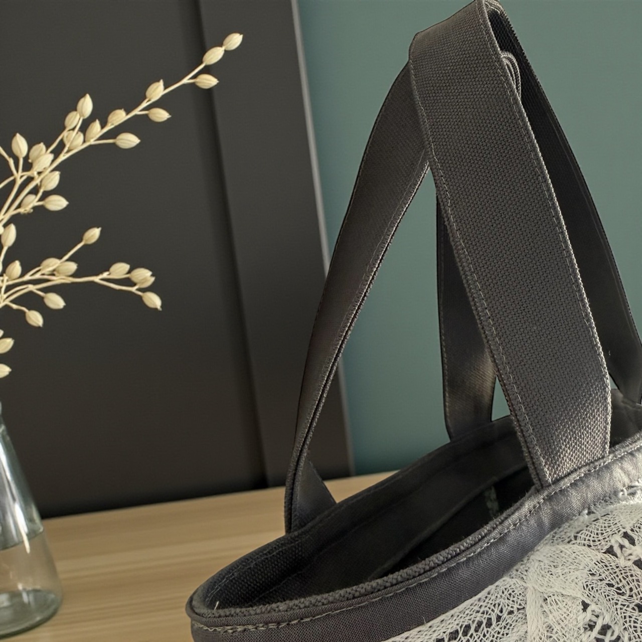 こちらの「バテンレースフリル・ミニマルトートバッグ」は、シックなグレーの帆布生地に、かわいいフリルが施された新しいスタイルのバッグです。クールな印象と可愛らしさを兼ね備えており、大人の女性にぴったりのデザインです。帆布生地はしっかりとしており、内側は緑の小花柄でパイピングされ、可愛いアクセントを加えています。ポケットも一つついており、整理整頓もバッチリです!