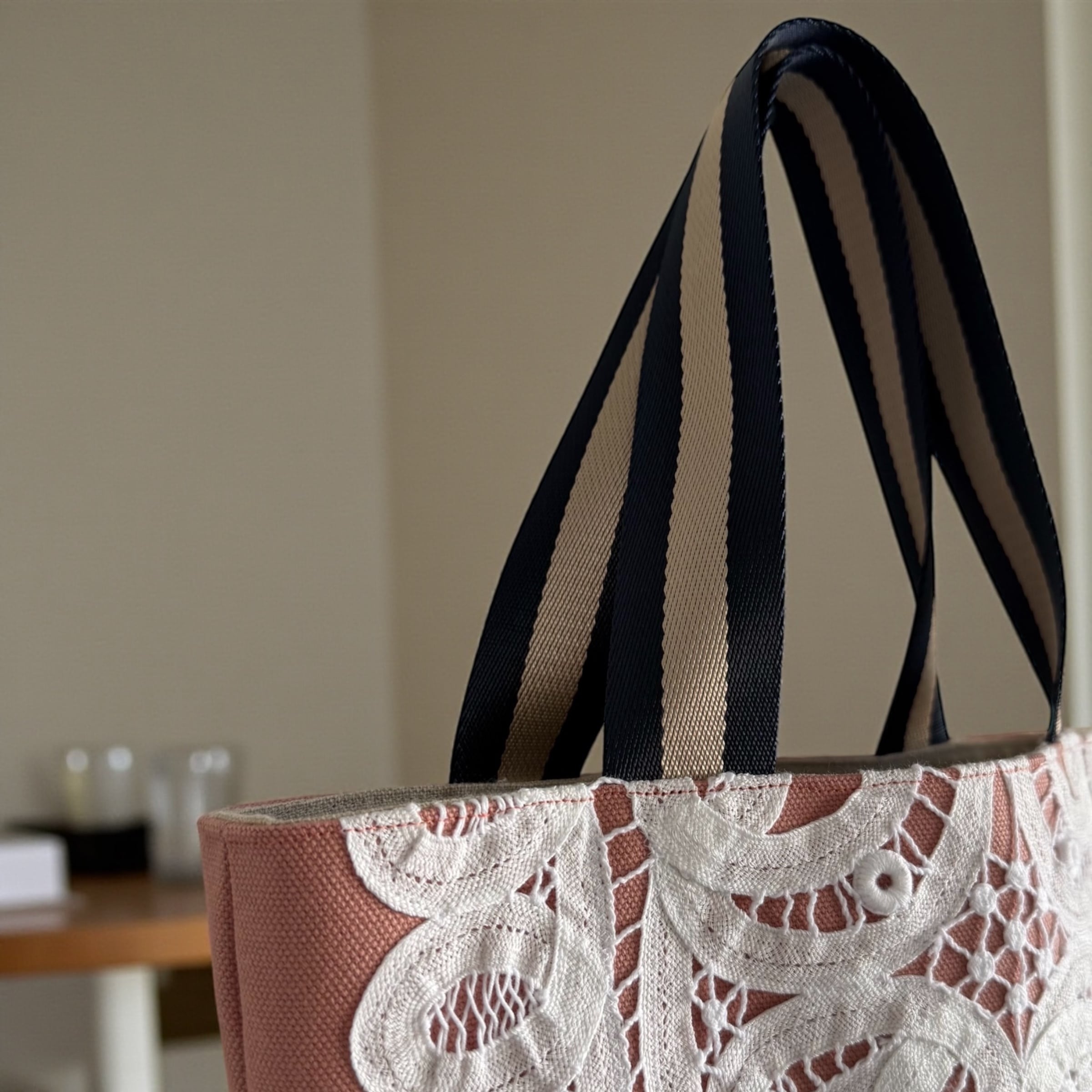 こちらの「【再販】人気のエレガントトートバッグ サーモンピンク」は、2025年も人気を誇る洗練されたアイテムです。大人かわいいサーモンピンクの帆布生地は、白いバテンレースとのコントラストが印象的で、シックでありながら明るさを感じさせます。持ち手にはネイビーとゴールドが使われており、上品さを引き立てています。また、サイズ感も日常使いに最適で、使い勝手抜群のデザインです!