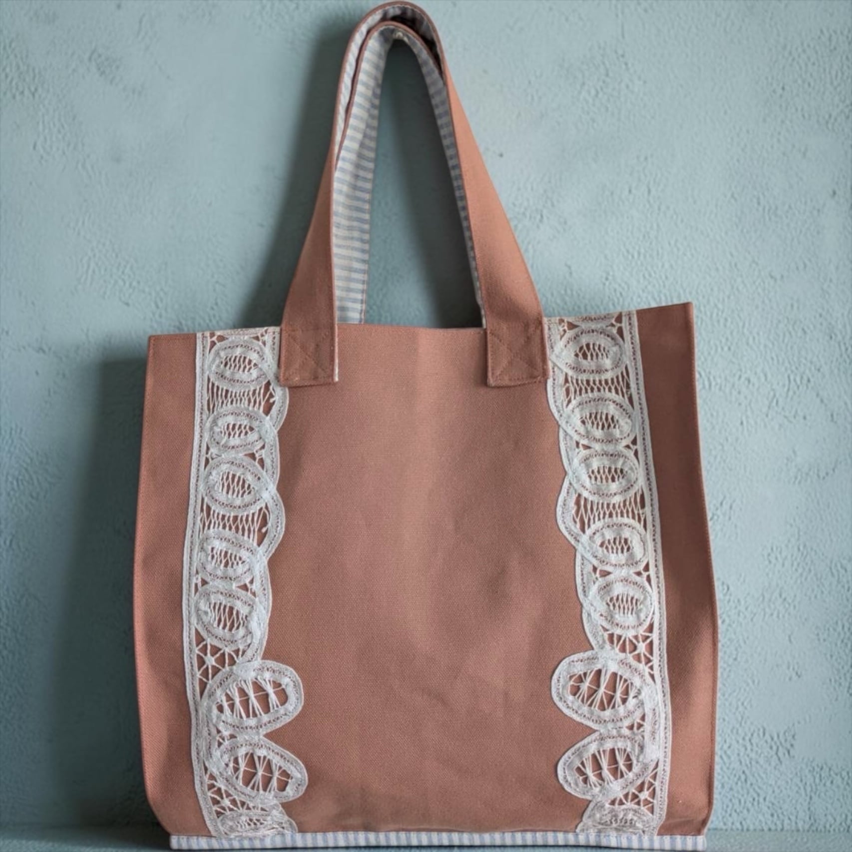やわらかなサーモンピンクが印象的な、大人かわいいトートバッグ。