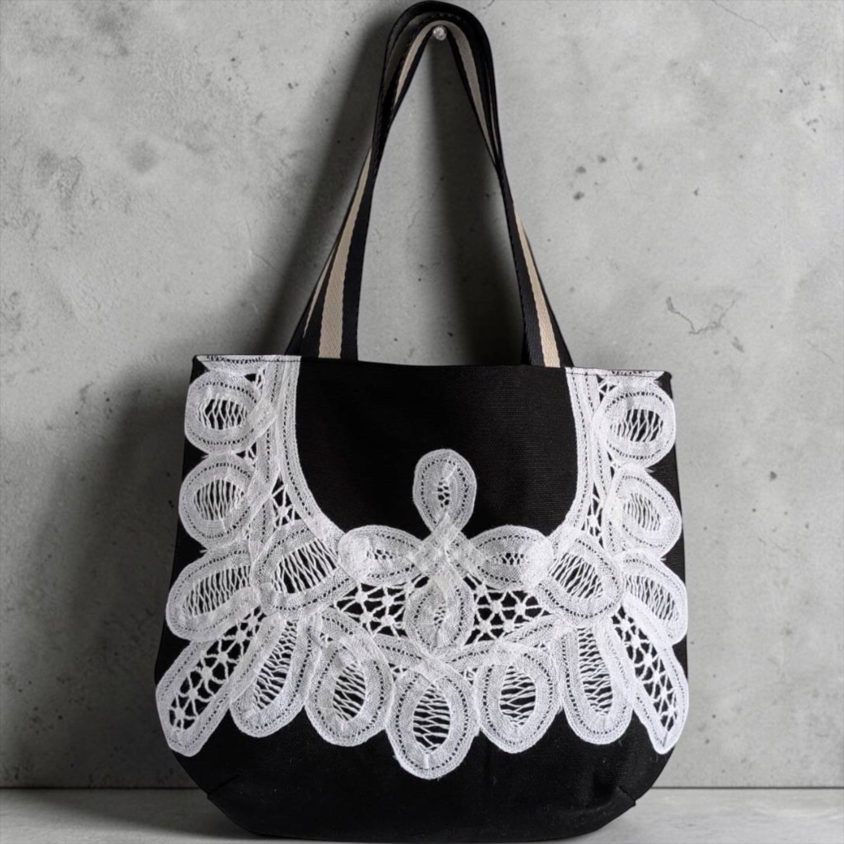 定番のブラック生地に、ホワイトのバテンレースをあしらったトートバッグ。